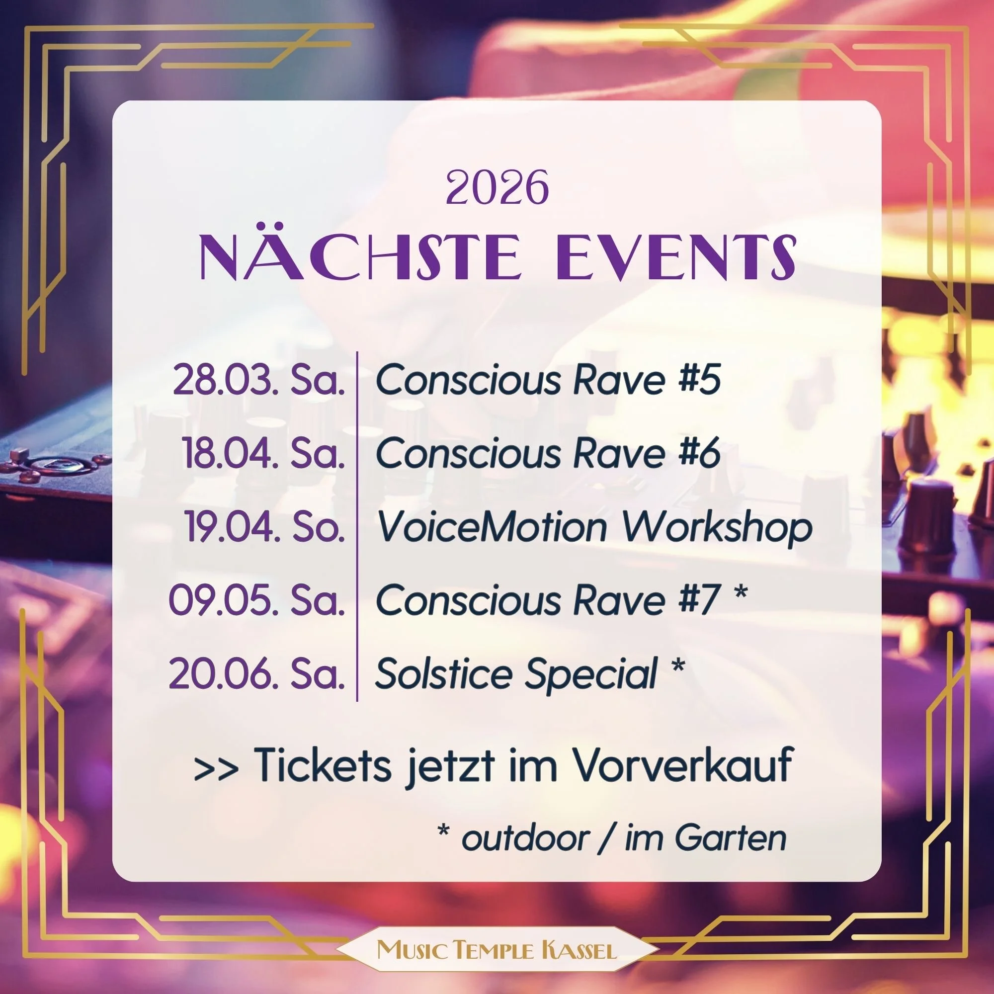 Für den Conscious Rave stellen wir auf Anfrage auch ermäßigte Tickets zur Verfügung. Wenn du dir ein reguläres Ticket aktuell nicht leisten kannst, schreib uns einfach eine kurze E-Mail an musictemplekassel@gmail.com wir finden dann eine Lösung.